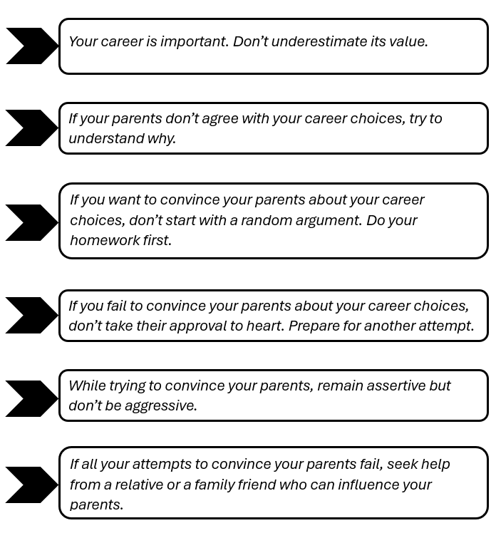 If your parents disagree with your career choices and you want to convince them, below tips can be useful: