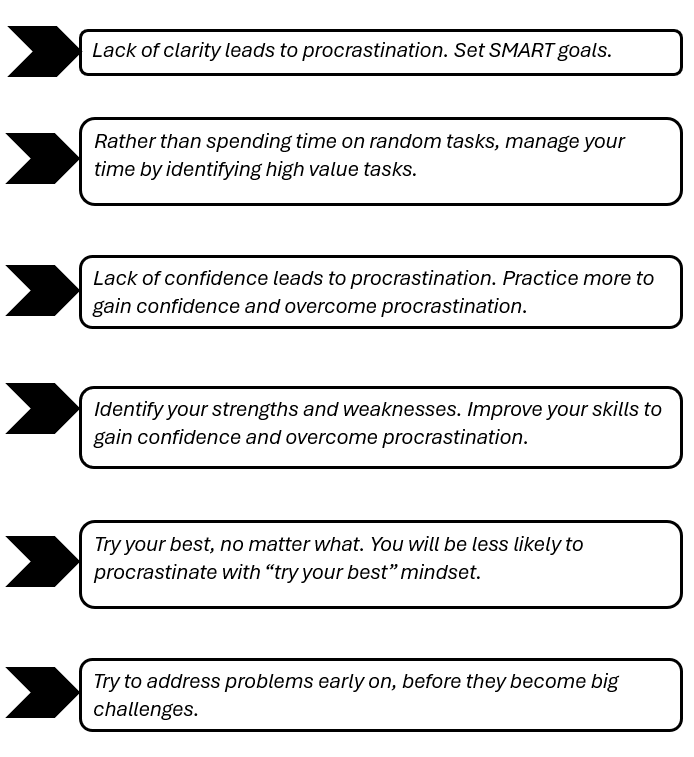 Sometimes, procrastination is due to lack of confidence. Practice or preparation boosts your confidence.