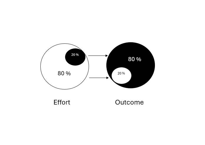 Where applicable, use the 80/20 rule, also called the Pareto Principle. The 80/20 rule says that every list of ten tasks should include two tasks that are much more important than the others.; focus on those two. Most people make the mistake of dealing with the easy things – the 80 percent – and procrastinate on the remaining 20 percent that really matters but seems tedious.